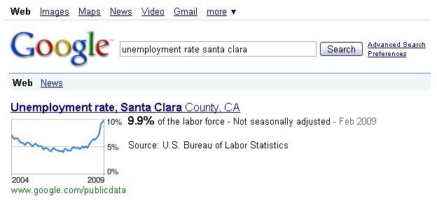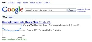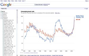 We just launched a new search feature that makes it easy to find and compare public data. So for example, when comparing Santa Clara county data to the national unemployment rate, it becomes clear not only that Santa Clara’s peak during 2002-2003 was really dramatic, but also that the recent increase is a bit more drastic than the national rate: