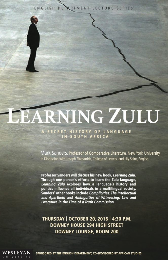 Oct 20: Mark Sanders on his new book, Learning Zulu October 5, 2016 / profmikenelson / Leave a comment Source: Oct 20: Mark Sanders on his new book, Learning Zulu | African Studies News @ Wesleyan